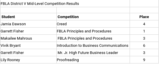 Six Guy-Perkins High School students were among the top finishers recently at the Arkansas FBLA District V Mid-level Virtual Competition (see above). Donna Acre is the FBLA sponsor at Guy-Perkins High School. Congratulations to all of these students!