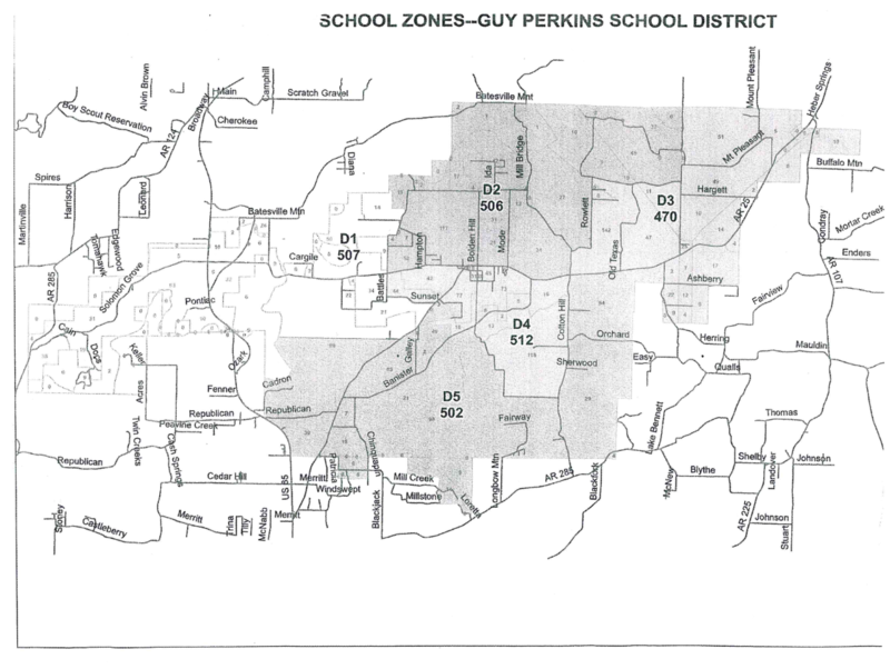The Guy-Perkins School Board is seeking interested patrons from Zone D2 and Zone D5 (see map below) willing to be appointed to serve on the board for the 2021-22 school year. If you are a registered voter living in either of these two zones and are interested, please send a letter of interest to Guy-Perkins School District, c/o James Rooney, Board President, 492 Hwy 25 N, Guy, AR 72061. Deadline for consideration is April 19.